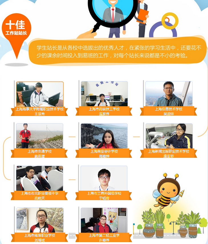 在这里,我们也来看看另外几位各具特色的学生代表。副站长,兼策划部部长,范小枫同学,平日在工作站中出谋划策,充当着谋士的身份,总是认真负责地优秀完成工作,与站长共进退。宣传部部长,李婕同学,当你看到校园里一副副关于易班的海报时,一定是李婕同学的手笔了,身为美术设计与制作的学生,平日里她画得一手好画,更是为易班的工作增光添彩。技术部部长,廖行同学,身为唯一一位男性部长,他也身兼数职,总是乐于助人,老师交代的任务能够及时完成,是一个可以安心托付工作的人。最后一位,记者部部长,杨冰莹同学,她才华不横溢,文章不出挑,但她工作认真负责,可谓是勤勤恳恳。