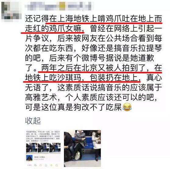 之后,鸡爪女又被拍到在上海地铁上吃麻辣烫可能光吃鸡爪有些干换了个有汤水的,真是想不通家里、饭店、便利店可以吃东西的场合那么多为什么一定要跑到摩肩接踵的地铁上吃?