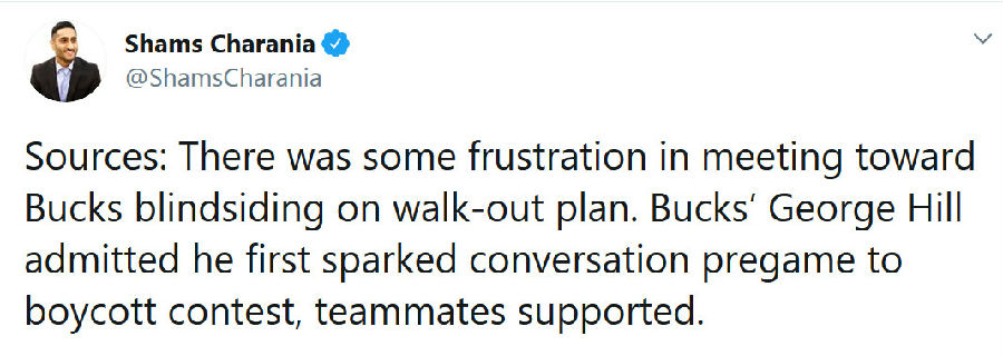 雄鹿球员乔治-希尔承认,是自己率先提出了罢赛的想法,随后得到了队友们的支持。