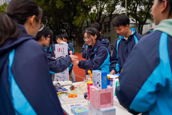 经过一个小时的爱心义卖活动,原本琳琅满目的各班摊位已经空空如也,但每一位老师和同学却都是大包小包收获满满,与好友交流、分享自己买的好物。