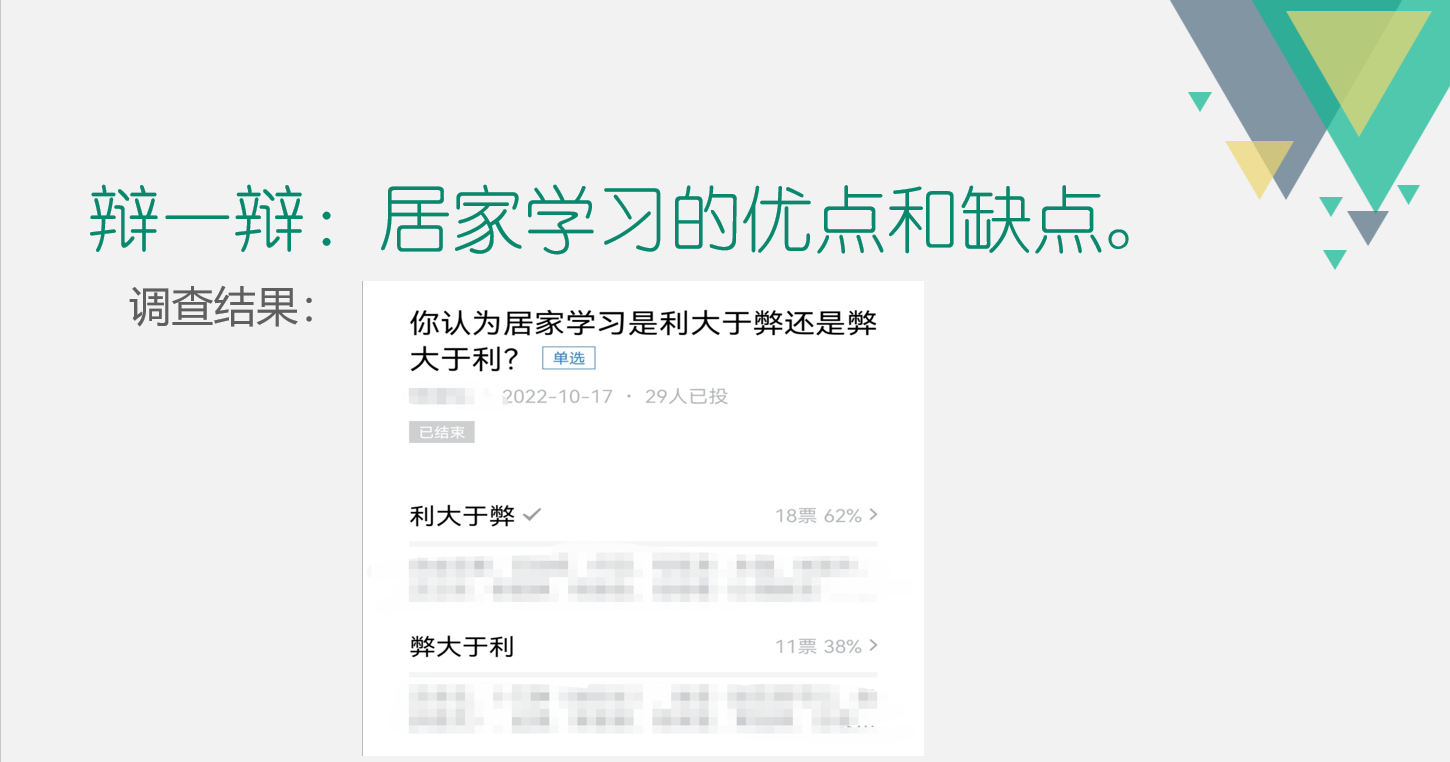 同学们通过各抒己见,充分表达了对上网课的看法,同时在辩论中相互借鉴对方辩友的观点和立场,更加辩证地看待“上网课之利与弊”这个现象与话题。此外,针对居家学习生活中的一系列不良习惯,强调应格外重视并做出及时纠偏,最终全体共同支招,对坏习惯集体SAY NO!