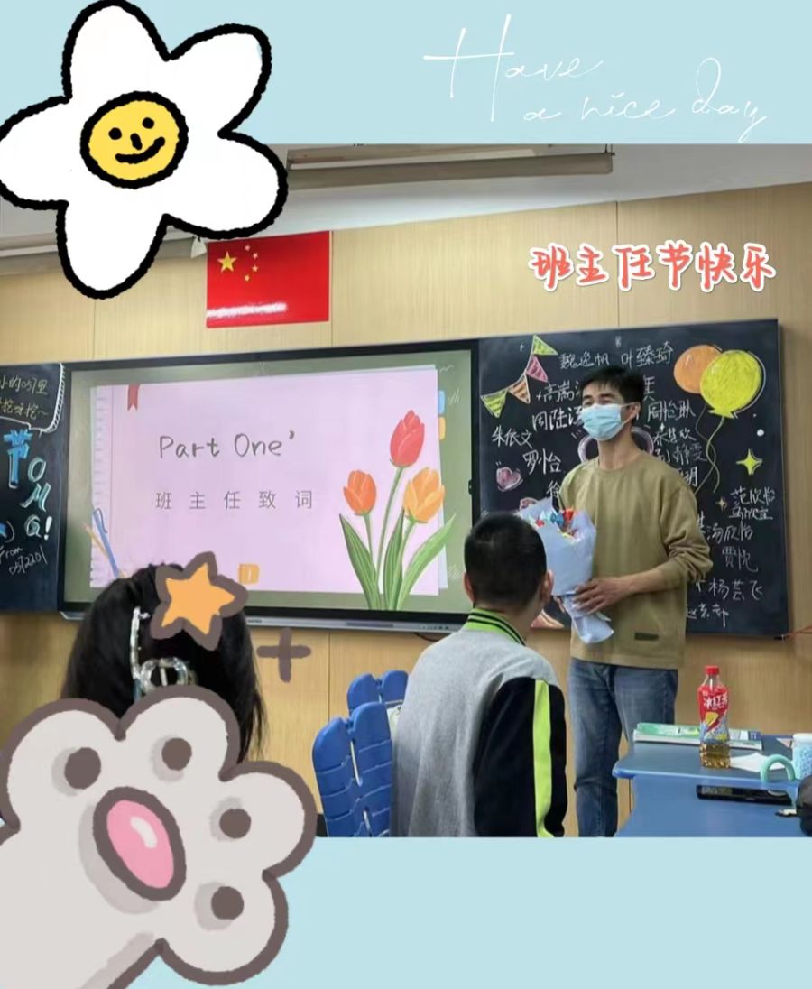 本次主题班会由 汤欣怡 同学主持,开展“感恩相伴,守护成长”主题班主任节活动,向班主任吴小毛老师表达谢意。