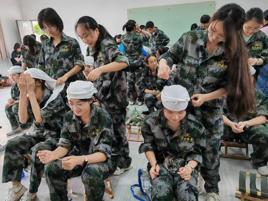 两两结为一组,为身边的“伤病员”进行包扎。