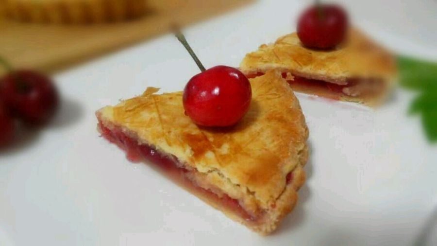ps: 1、制作樱桃馅的时候,必须经过两个小时以上的腌制,才可以产生足量的汁液。如果没有时间,可以把新鲜樱桃加糖后,放入小锅里煮沸,能立即得到汁液。但樱桃经过烹煮,口感会和新鲜樱桃不一样,看个人喜好决定是否采用这种方法。 2、樱桃馅中加入柠檬汁,是因为派馅里必须有足够的酸,才会具有应有的风味。如果你的樱桃是非常酸的那种,则可以省略柠檬汁。 3、如果烤的是比较大尺寸的派(6寸以上),为了防止派皮烤后底部不平,可以在底部放几块压物石或者耐烘焙的其他重物。 4、这款派皮面团特点在于,吸水性差,口感酥松,所以特别适合樱桃馅这种水分含量大的馅料,派皮不会因为吸收水分变得湿软。但还是建议尽量在食用前再填入馅料哈。 5、派皮面团的配料里加入了蛋黄,所以口味比一般的派皮更好。如果你觉得蛋黄用后剩下的鸡蛋不好处理,不想用蛋黄,也可以用15克黄油代替8克蛋黄。