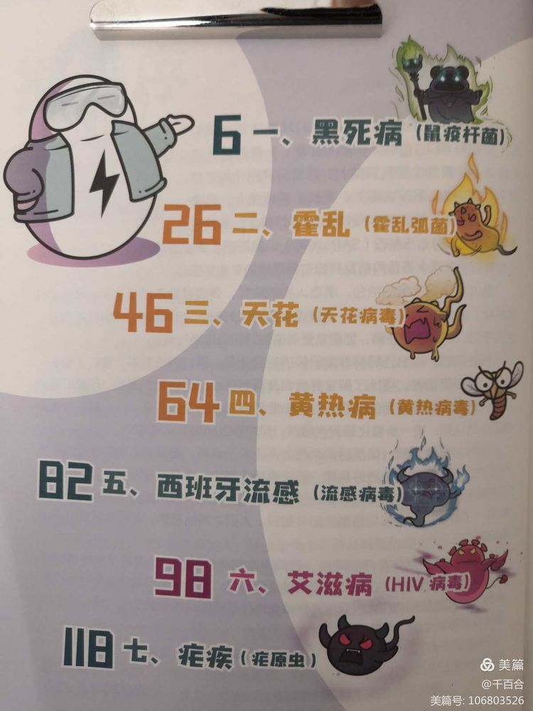漫画讲了人类历史上经历的各种病毒、细菌的攻击,人类的病痛史就是这些细菌病毒的肆虐史,很多传染病把人类折腾的奄奄一息,甚至直接亡国灭种,也是有的。记得最深刻的便是黑死病,席卷整个欧洲大陆,非战斗性减员基本直接对半砍,甚至发生前一晚家中还有动静,第二天全家都去见上帝的人间惨剧。同时因为发病时身体皮肤会发黑,在一定程度让死神成为穿着黑衣的角色,也有它的功劳。