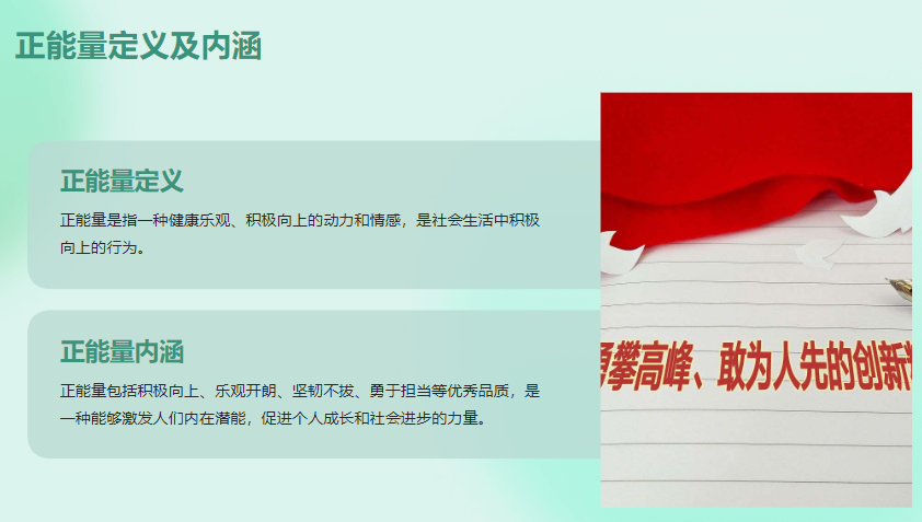学会传播正能量,是点亮生活光芒的钥匙。在纷扰的世界中,让我们成为那一抹温暖的光,用微笑和鼓励驱散阴霾,用积极和乐观感染他人。每一次善意的传递,都是对美好世界的贡献;每一句正能量的话语,都能激发内心的力量。让我们携手同行,在生活的每一个角落播撒爱与希望,共同营造一个更加温馨、和谐的社会。同学们请记住,你的每一次正能量传播,都可能成为他人生命中不可或缺的光芒。