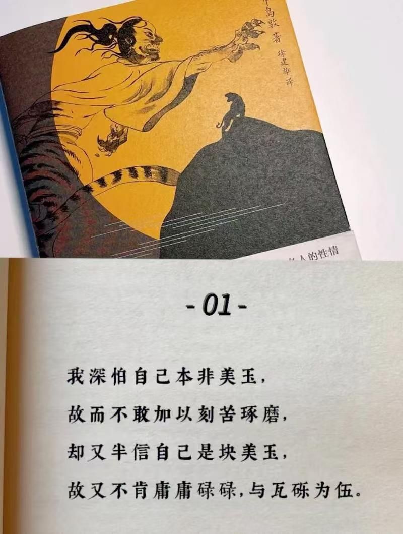 “我深怕自己本非美玉,故而不敢加以刻苦琢磨,却又半信自己是块美玉,故又不肯庸庸碌碌,与瓦砾为伍。于是我渐渐地脱离凡尘,疏远世人,结果便是一任愤懑与羞恨日益助长内心那怯弱的自尊心。”这句话出自于日本作家中岛敦的《山月记》。也正是因为这句话让我去了解以及阅读这本书。