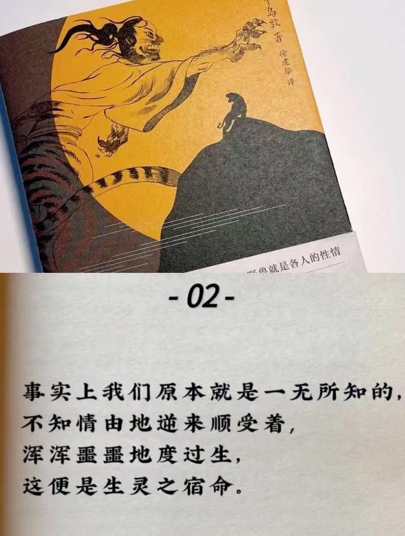 此篇讲述了才子李征因傲慢与自卑而逐渐失去人性,最终化身为虎的故事。作品集浓郁的中国古典气质与诡谲的日本怪谈风于一体,别出心裁,文辞优美。擅长对人心与人性的刻画,既是对生命的追问,又是对自我的探索。与寻常的心灵鸡汤不同,本书的切入点不在词藻之华丽,反而追求言语之平实,以柔韧有力、直击内心之文字,出奇制胜。如一杯馨香茗茶,萦绕胸腔,回味甘而清甜。读完这本书后给我最大的感受就是:世界上每个人都是驯兽师,而那匹猛兽,就是每个人各自的性情。”驯服自己内心的猛兽、磨练自身桀骜的性情是所有人一生的课题。在寻求答案的路上,我们难免会遇到各种各样的精神困境,需以平静的心态、坦然的态度,戒骄戒躁、脚踏实地,方能走出一个个精神困境,守得云开见月明!