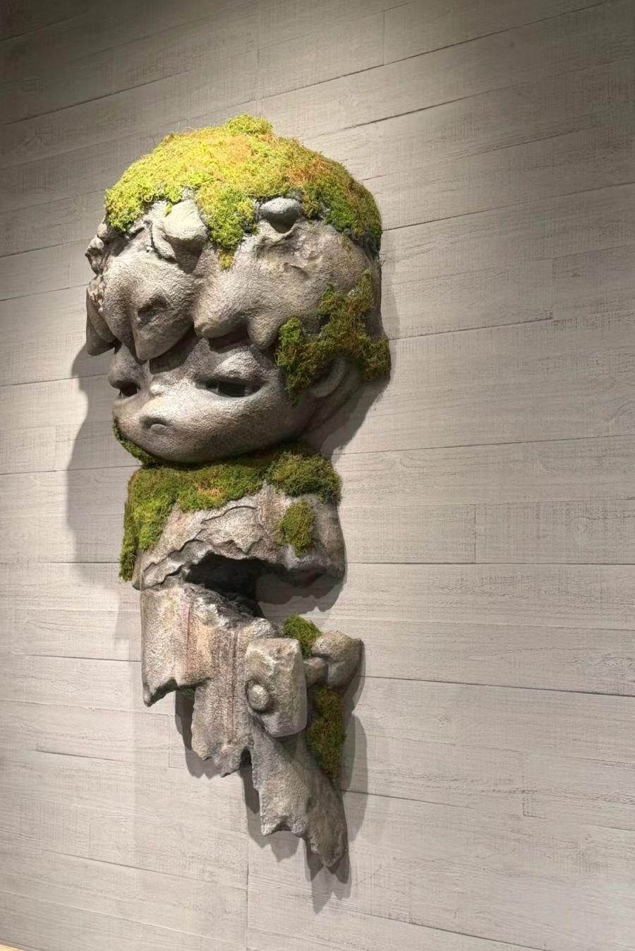 雕塑被固定在一面浅色的木纹墙前,墙面简洁而有质感,与雕塑的自然元素形成对比,同时突出了雕塑的主体地位。整个作品仿佛讲述着自然与时间的力量,即使在人类的雕琢下,自然仍以它的生命力重新定义了艺术的形态,展现了自然与人工交融的和谐之美。