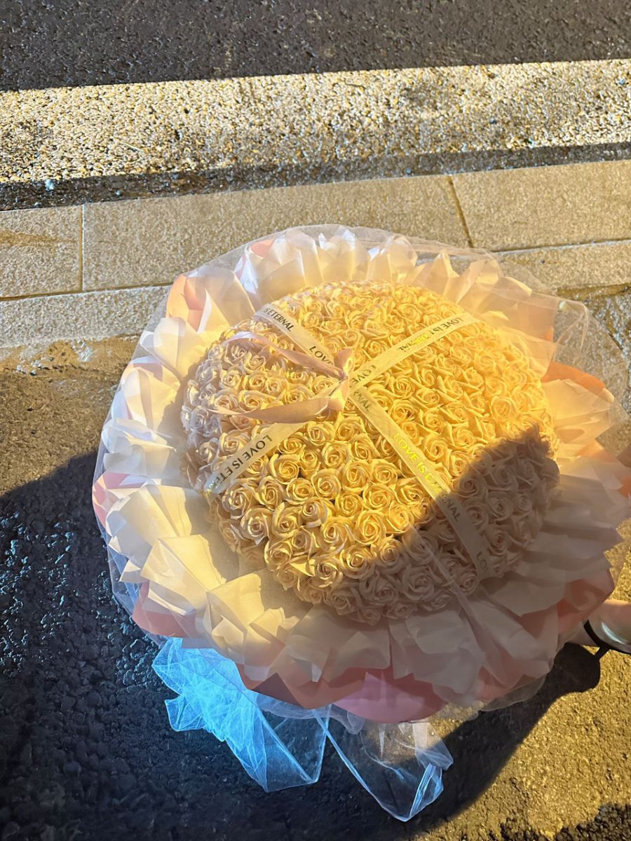 它被置于湿润的路面旁,地砖的冷硬与花束的柔美形成反差,却更衬出这份心意的炽热。或许是为一场惊喜的告白,或许是为纪念一段深情的岁月,这束花在夜色里静静伫立,将爱与温柔,酿成了街头最动人的风景。