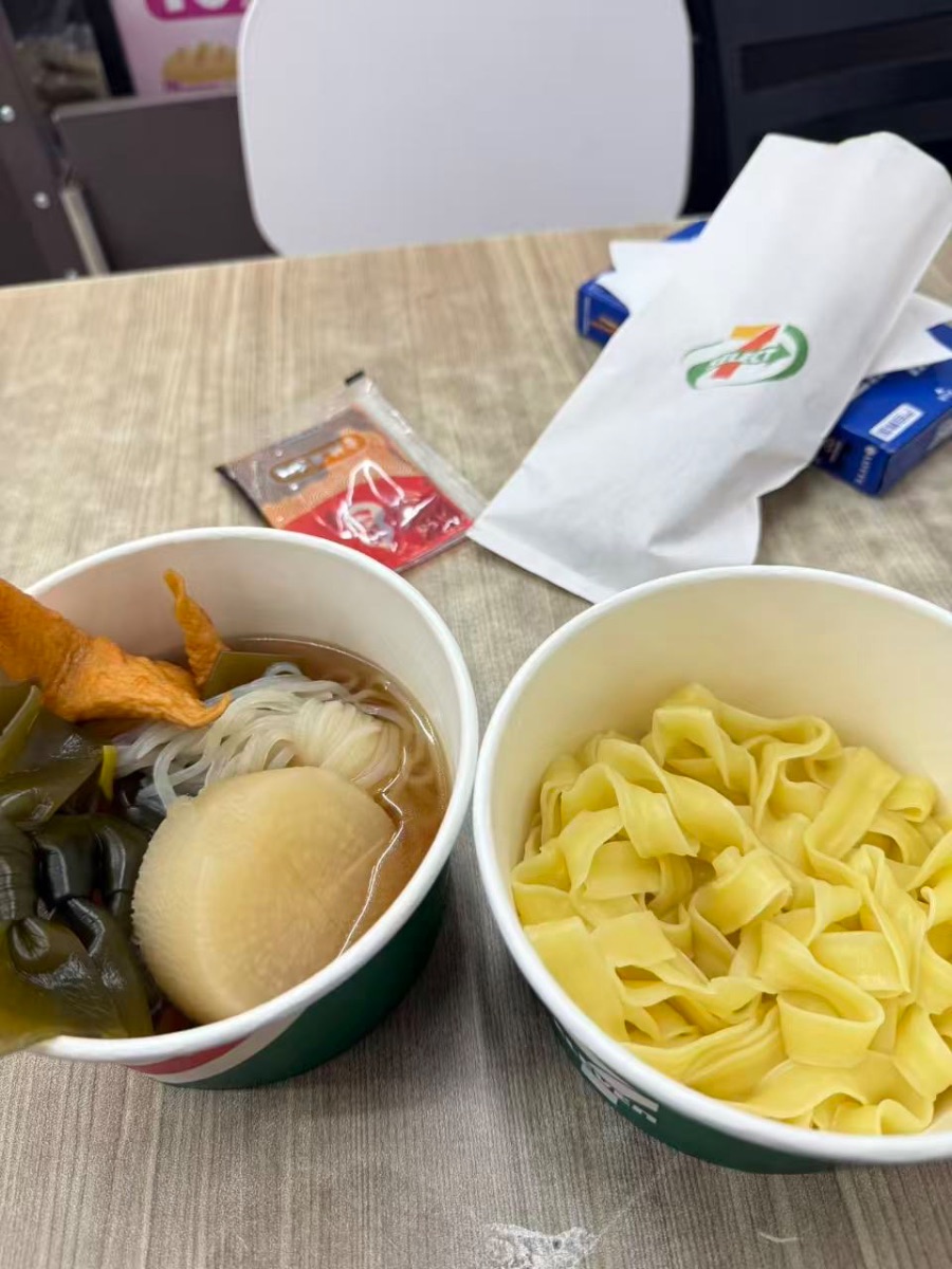 711的木纹桌上,一碗刀削面和关东煮凑成了最熨帖的慰藉。宽薄的刀削面堆得蓬松,碱香裹着面身的筋道,等着浇上热汤就能裹满香气;旁边的关东煮里,溏心蛋浸得透亮,咬开时流心蛋黄裹着鲜咸汤汁,海带结脆嫩吸饱了味,炸腐竹泡得软绵,连萝卜都炖得入口即化。桌上的711纸巾和调料包透着随性,明明是便利店的简餐,却在冷意里暖得让人想把脸埋进碗沿——不用讲究摆盘,不用等太久,胃被填得满当的瞬间,就是平凡日子里的小圆满。
