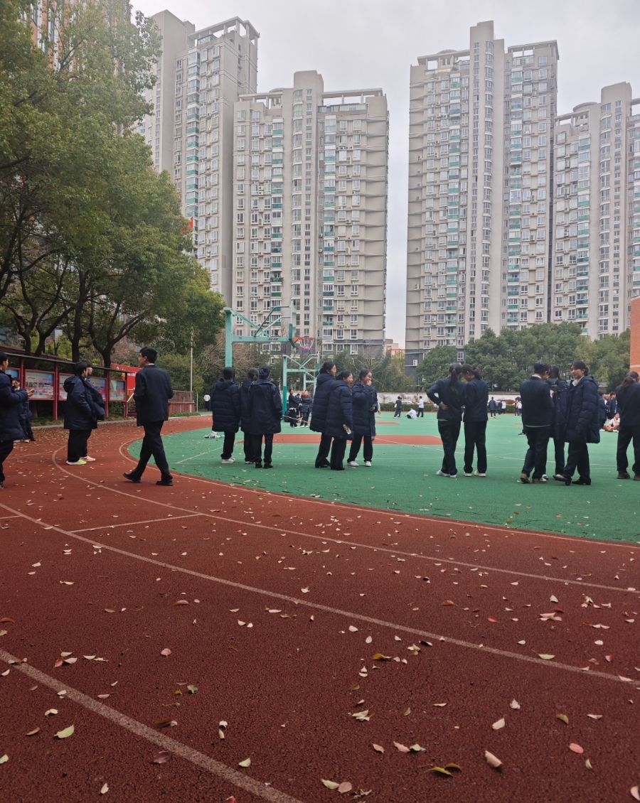 塑胶跑道上落满了枯黄的树叶,像给红棕色的跑道铺了一层细碎的绒毯。穿着藏青色校服的学生们三三两两聚在操场,有的低头说笑,有的望向篮球架,脚步里满是少年人的松弛。身后是林立的高层住宅,葱郁的香樟树在风里轻晃,把城市的喧嚣隔在围墙之外。