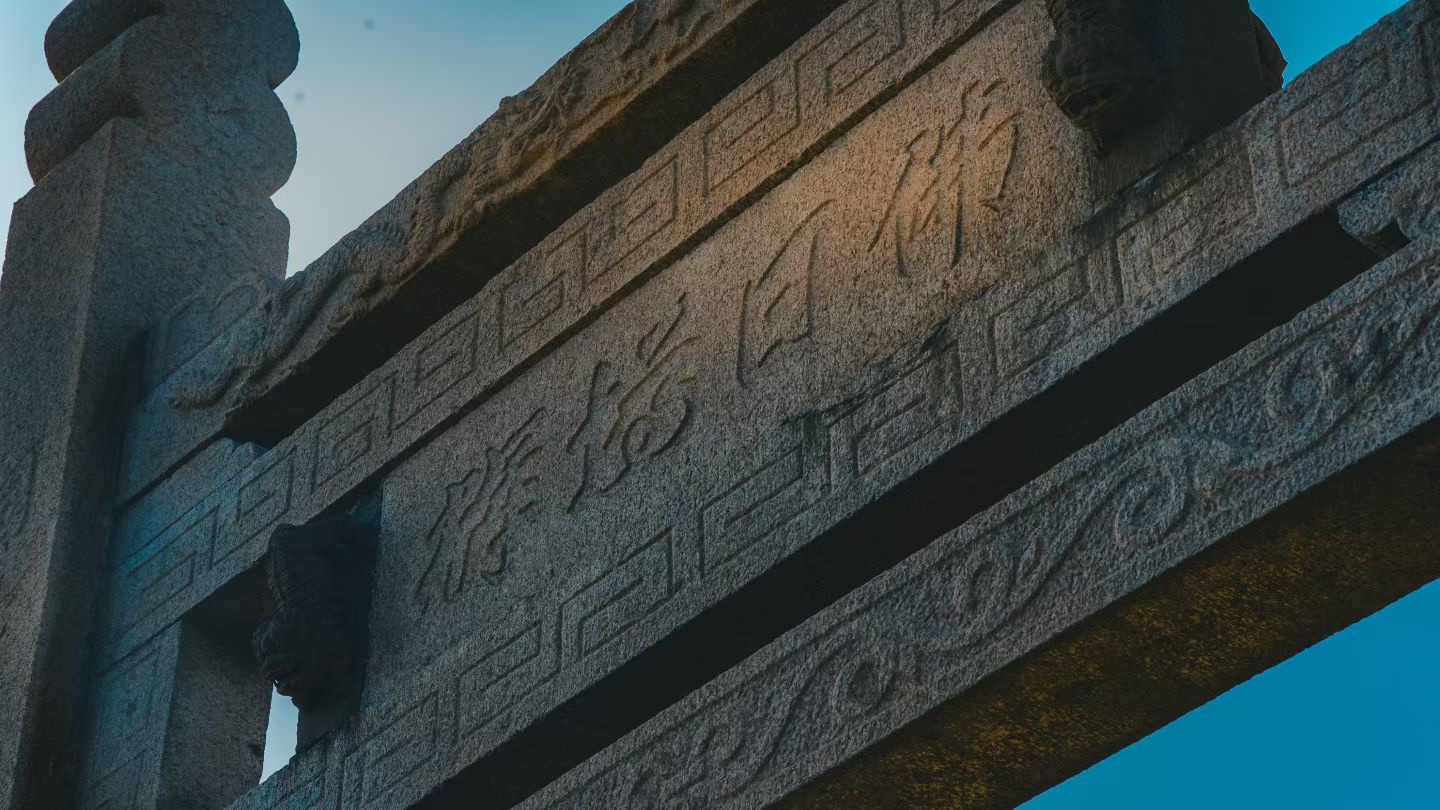 暮色四合,青灰色的石坊在天光下静默伫立,粗粝的石面镌刻着岁月纹路,每一道沟壑都藏着时光的故事。檐角的兽首虽经风雨侵蚀,仍守着一方天地,回纹浮雕规整古朴,与题刻的笔墨相映成趣。冷调的蓝天衬着石坊的沉郁轮廓,光影在石缝间流转,似在诉说往昔的香火与喧嚣。这方石坊不仅是建筑的遗存,更是精神的锚点,于静默中承载着信仰的重量,让每一位驻足者都能在斑驳石纹里,触摸到历史的温度。