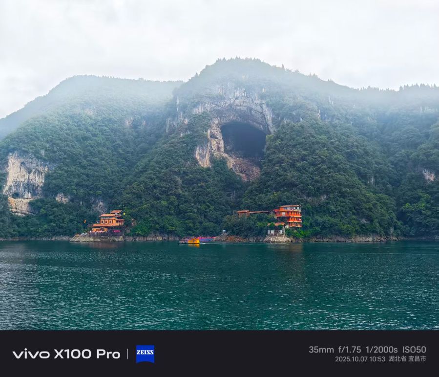 澄澈如翡翠的江水铺展眼前,粼粼波光漾开满湖清润,一艘游船划破水面,为静谧山水添了几分灵动。对岸青山巍峨,峭壁如削,一座天然形成的巨大岩洞嵌于山腹,在薄雾轻笼中更显神秘,仿佛是大山敞开的怀抱,藏着千年的故事。
