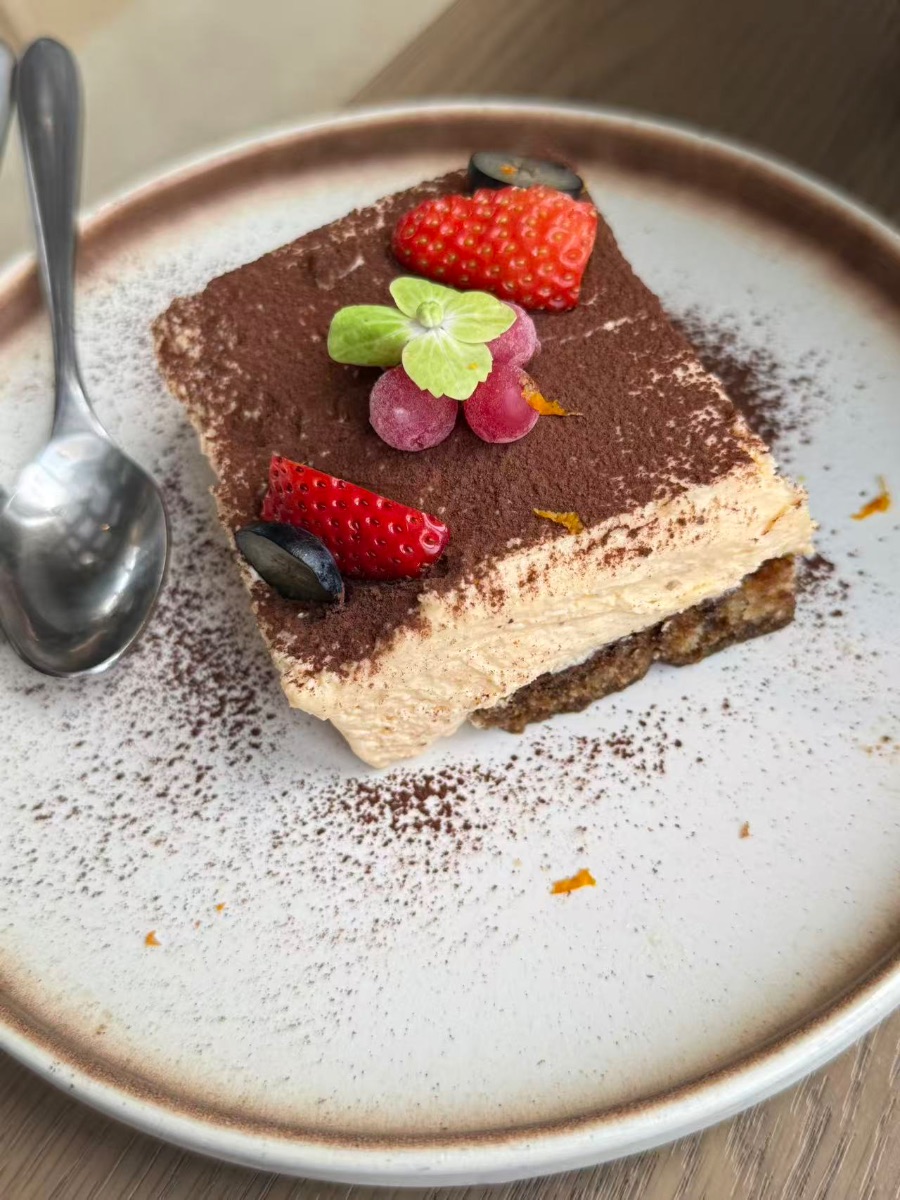 周末的午后,我坐在靠窗的位置,面前摆着一块精致的提拉米苏。深褐色的可可粉像一层温柔的雪,铺在绵密的奶油慕斯上,新鲜的草莓、蓝莓和冻红提点缀其间,还有一片嫩绿的叶子做装饰,光是看着,就让人心情大好。