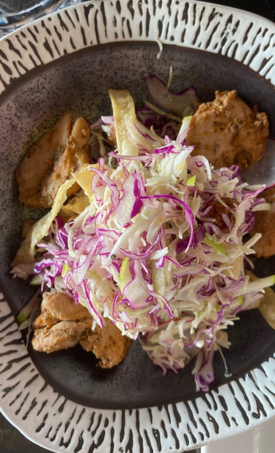 餐盘中央,堆叠着一大份爽脆的双色卷心菜丝沙拉,洁白的圆白菜丝与鲜亮的紫甘蓝细丝交错交织,间杂少量嫩绿色芹菜丝与淡粉色萝卜薄片,色泽清新明快,丝缕分明、蓬松饱满,看着就清爽解腻。沙拉四周环绕着几块煎制的调味烤肉,肉块表面带着诱人的焦褐肌理,香料调味的肌理清晰,外皮微微焦香,肉感紧实饱满。底部还垫有几片浅黄薄脆饼,丰富口感层次。