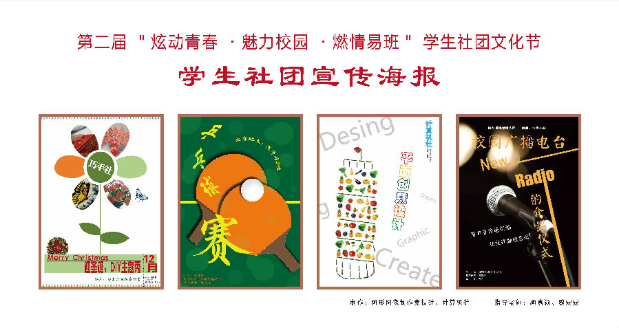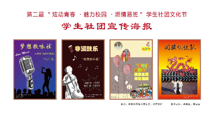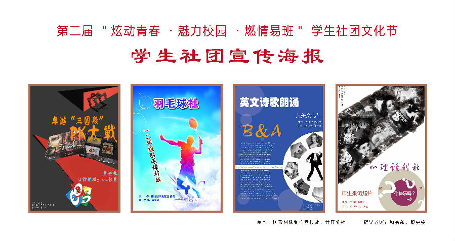 第二届“炫动青春 魅力校园 燃情易班”学生社团文化节正式拉开帷幕了~~。此次社团文化节,各社团老师和同学们都踊跃参加,图形图象竞技制作社和计算机社强强联手,为此次文化节每个社团都设计制作了漂亮的宣传海报,接下来请大家一起欣赏他们设计的海报~~我们将在文化节后开设投票活动,到时请为你喜爱的海报投上一票噢~~