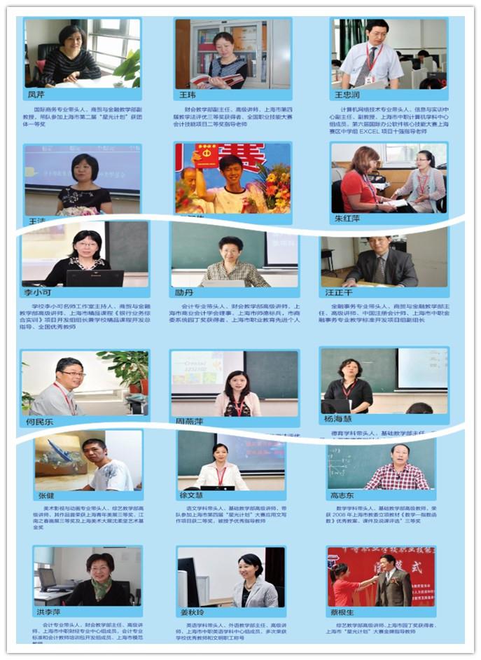 要培养一流的学生,势必要有一流的老师。学生的优秀。我们现在看到的是来自我校各专业的部分名师。学校现有专业教师262名,其中具有高级职称的就有29%,学校有2名教师获得“全国优秀教师”称号。有一名教师被评为上海市劳动模范,先后有18名教师获得“园丁奖”和“上海市优秀教育工作者”称号。下面陈列的是学校教职工近十年来教师主编部分材料、作品的目录,在下面分别是教职工所主编的书。在右边的是教职工论文的代表作,在其下方的是所刊登的书籍。